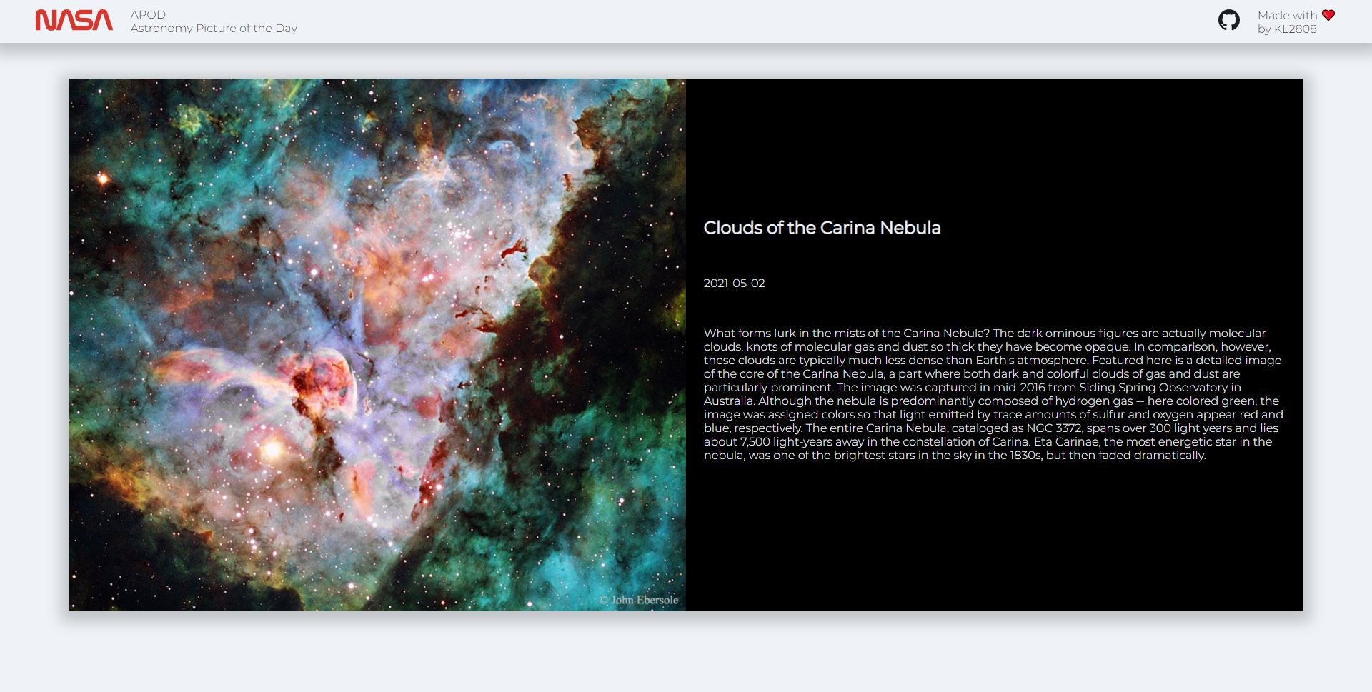NASA provides a lot of cool and fun to use APIs. I chose the simple yet super cool APOD (Astronomy Picture of the Day) API. NASA provides a new picture with a title, explanation and more additional info every day since 16. June 1995. Thank you, NASA ❤️.