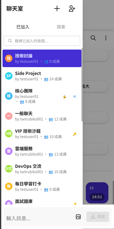 CRUD、加入/離開、成員管理、搜尋 |